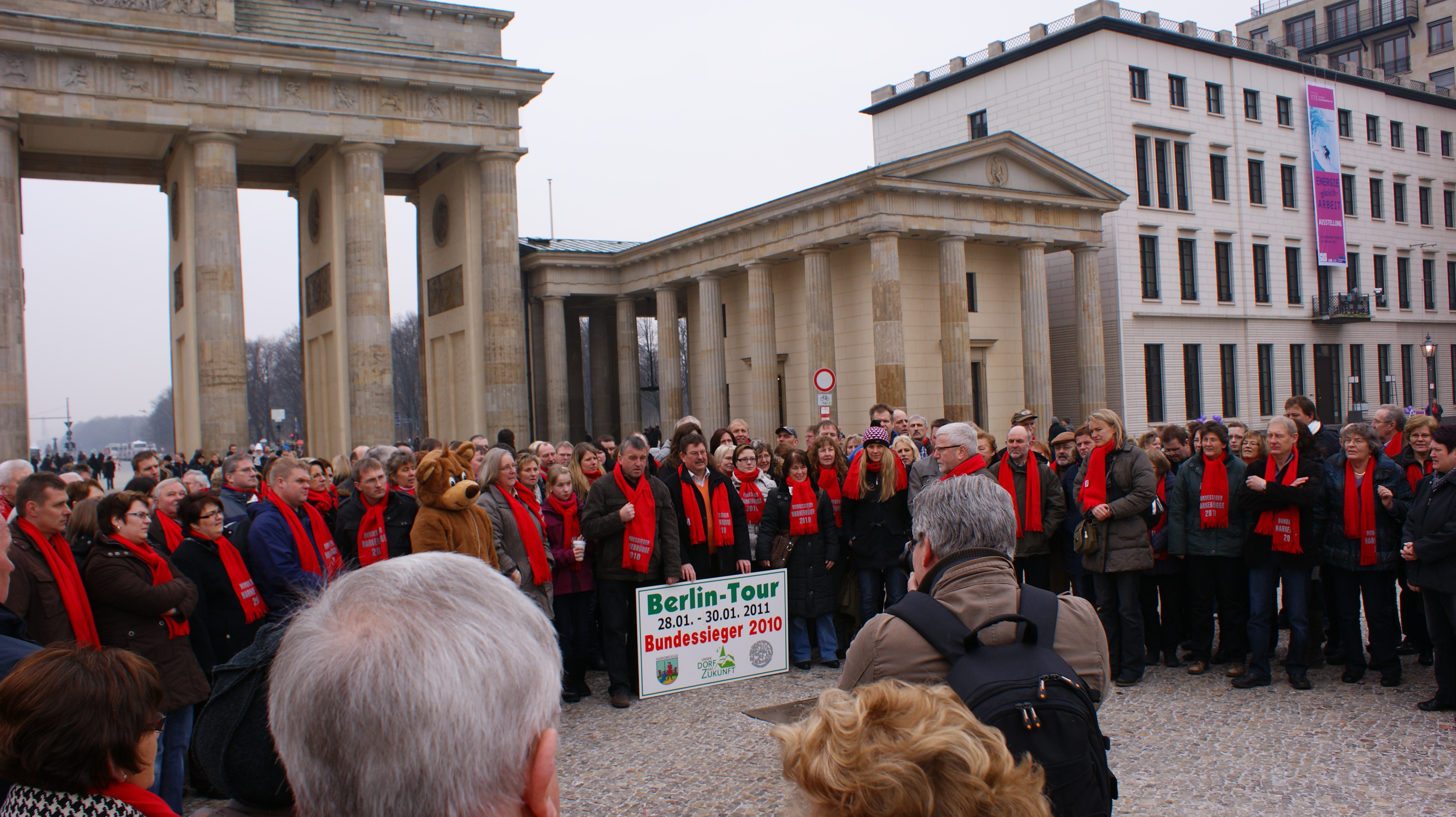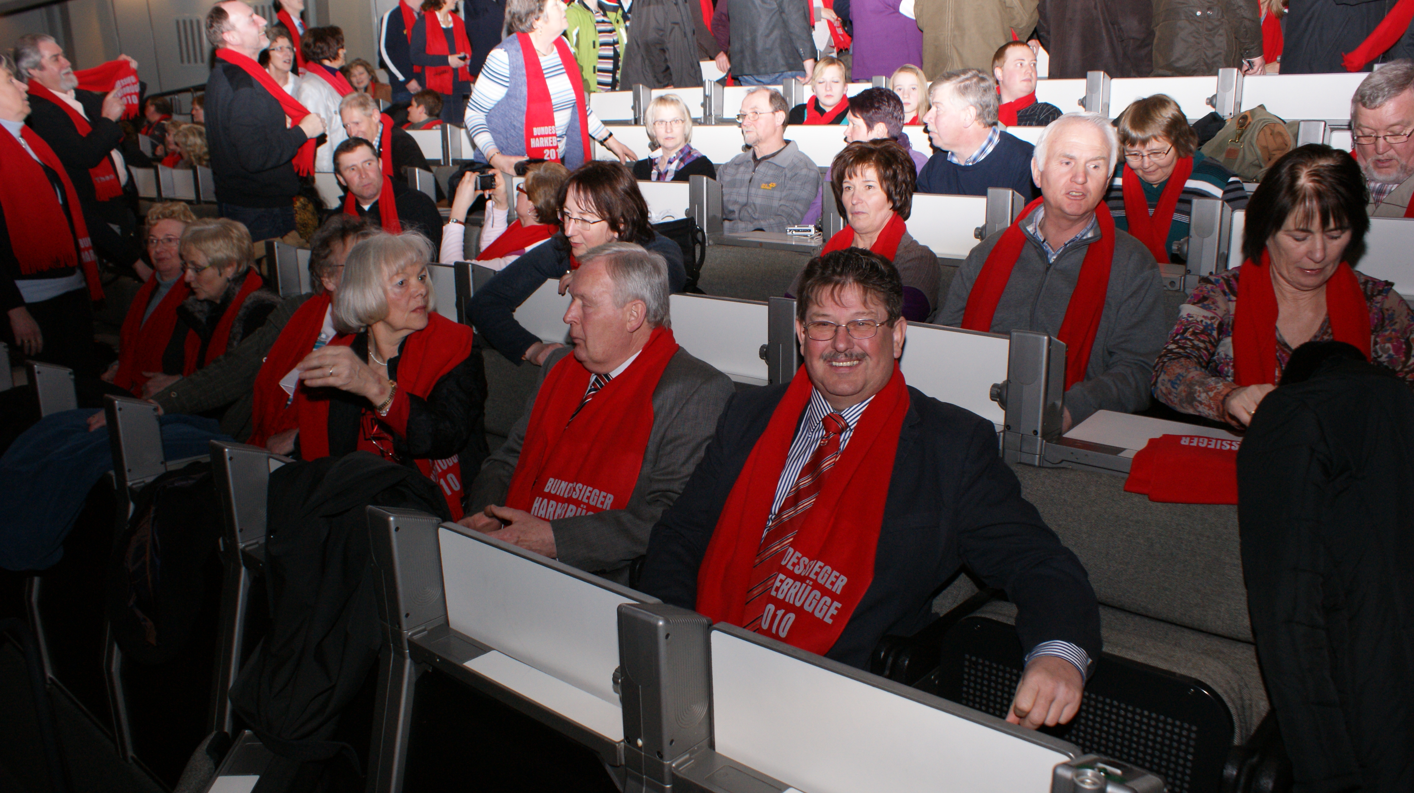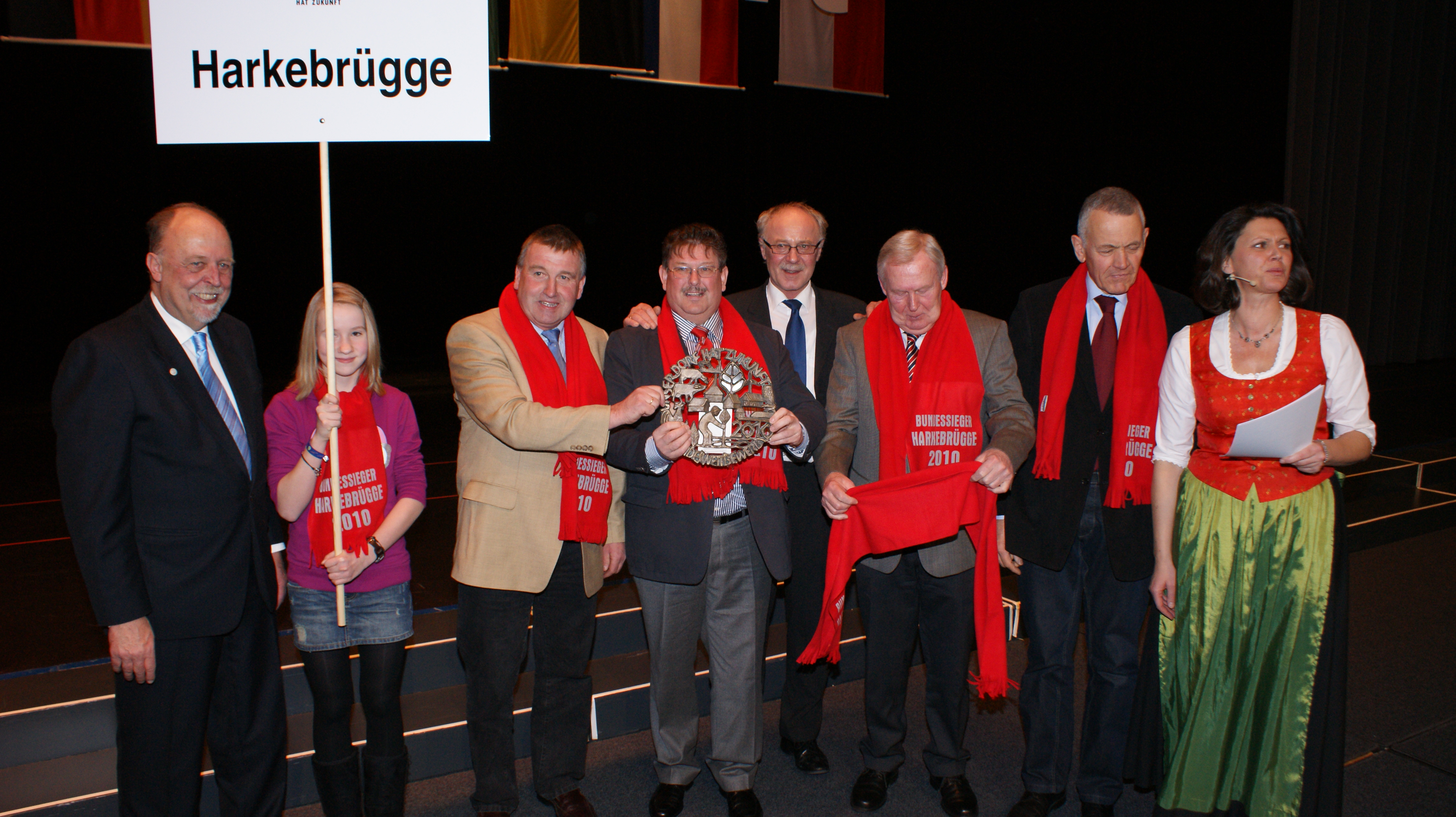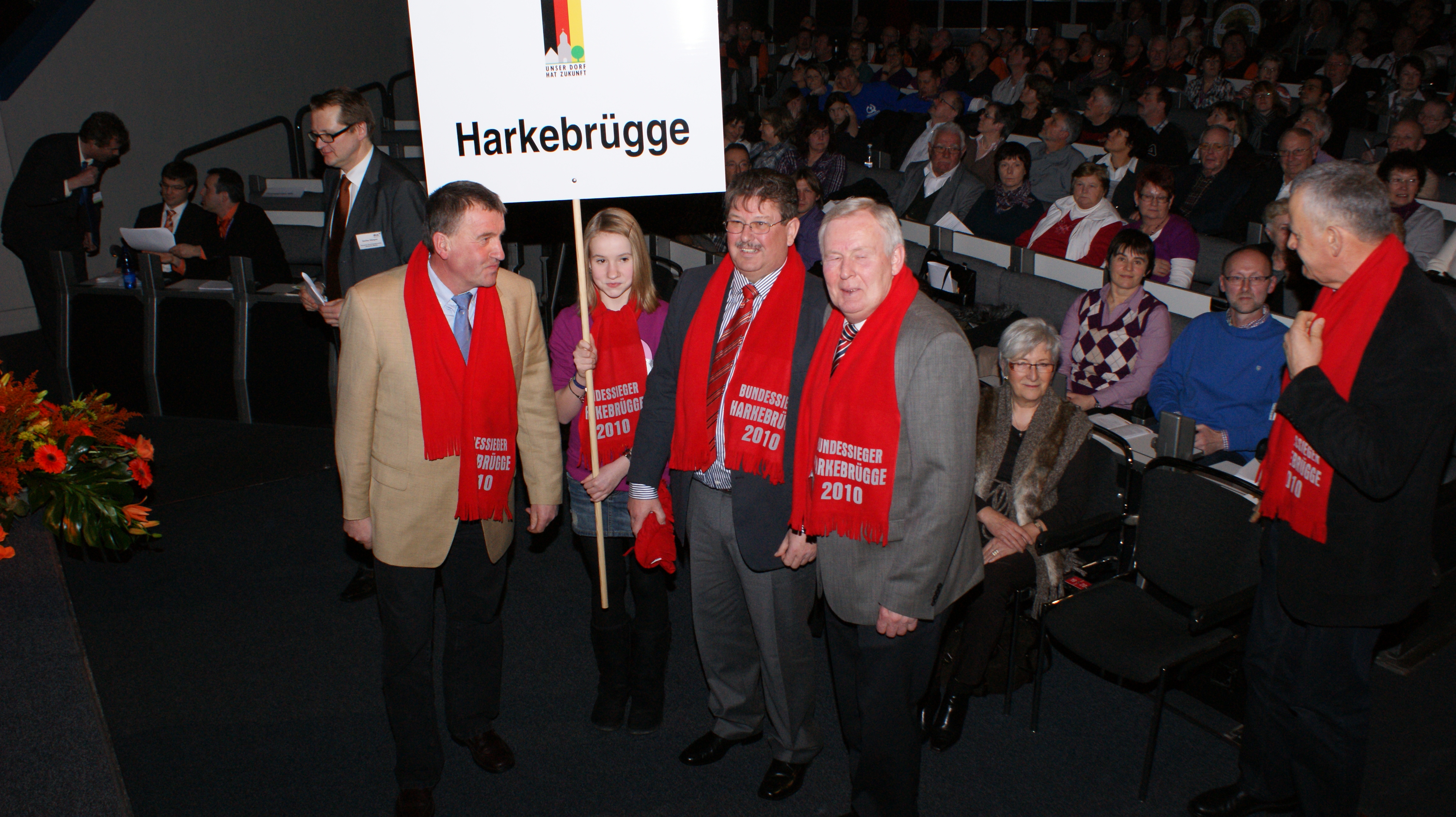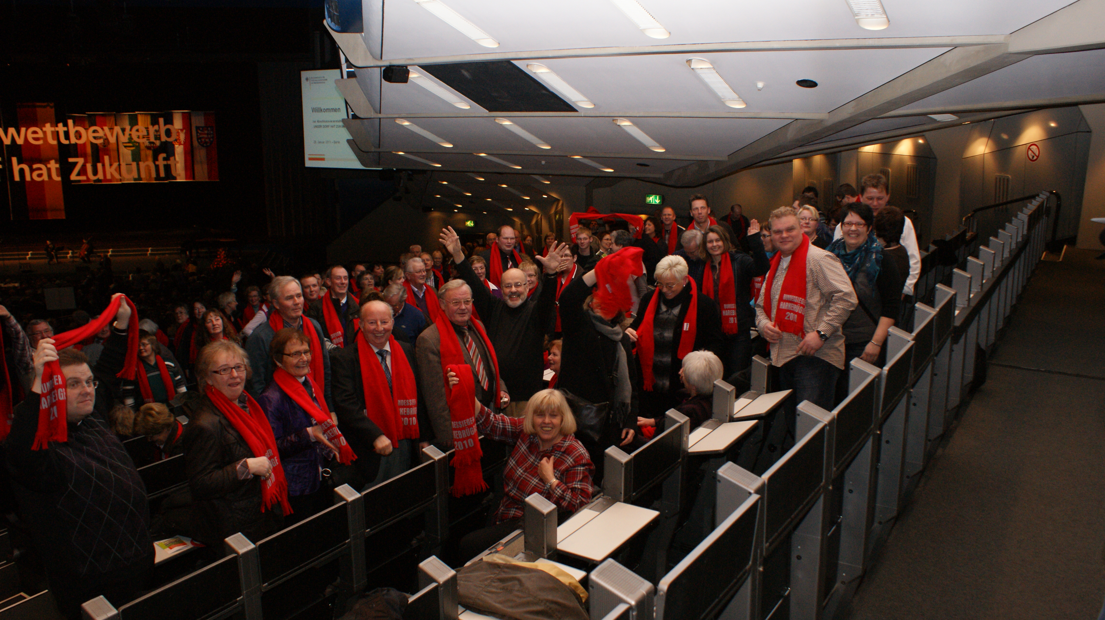 Mit sage und schreibe 238 Bürgern reisten die Harkebrügger in Begleitung des Musikvereins nach Berlin, wo uns durch die Bundeslandwirtschaftsministerin Ilse Eigner die Silbermedaille für die Teilnahme am Bundeswettbewerb „Unser Dorf hat Zukunft“ überreicht wurde. Vom Aktivkreis wurden neben der Reise auch für jeden Mitreisenden ein roter Schal organisiert. Ein tolles Bild und ein hoher Wiederkennungsfaktor. Während und vor Allem nach der Verleihung fielen die Harkebrügge durch die musikalische Unterstützung unseres Musikvereins auf, der für sicherlich für gute Laune und einen bleibenden Eindruck sorgt.