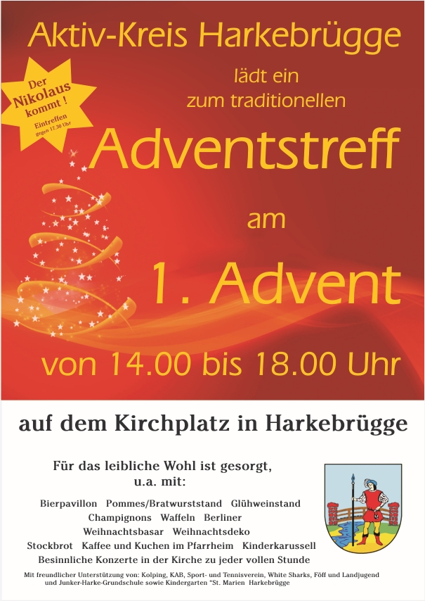 Der Aktivkreis Harkebrügge und die Harkebrügger Vereine laden zum traditionellen Adventstreff am 1. Advent von 14:00 – 18:00 Uhr auf dem Kirchplatz in Harkebrügge ein.