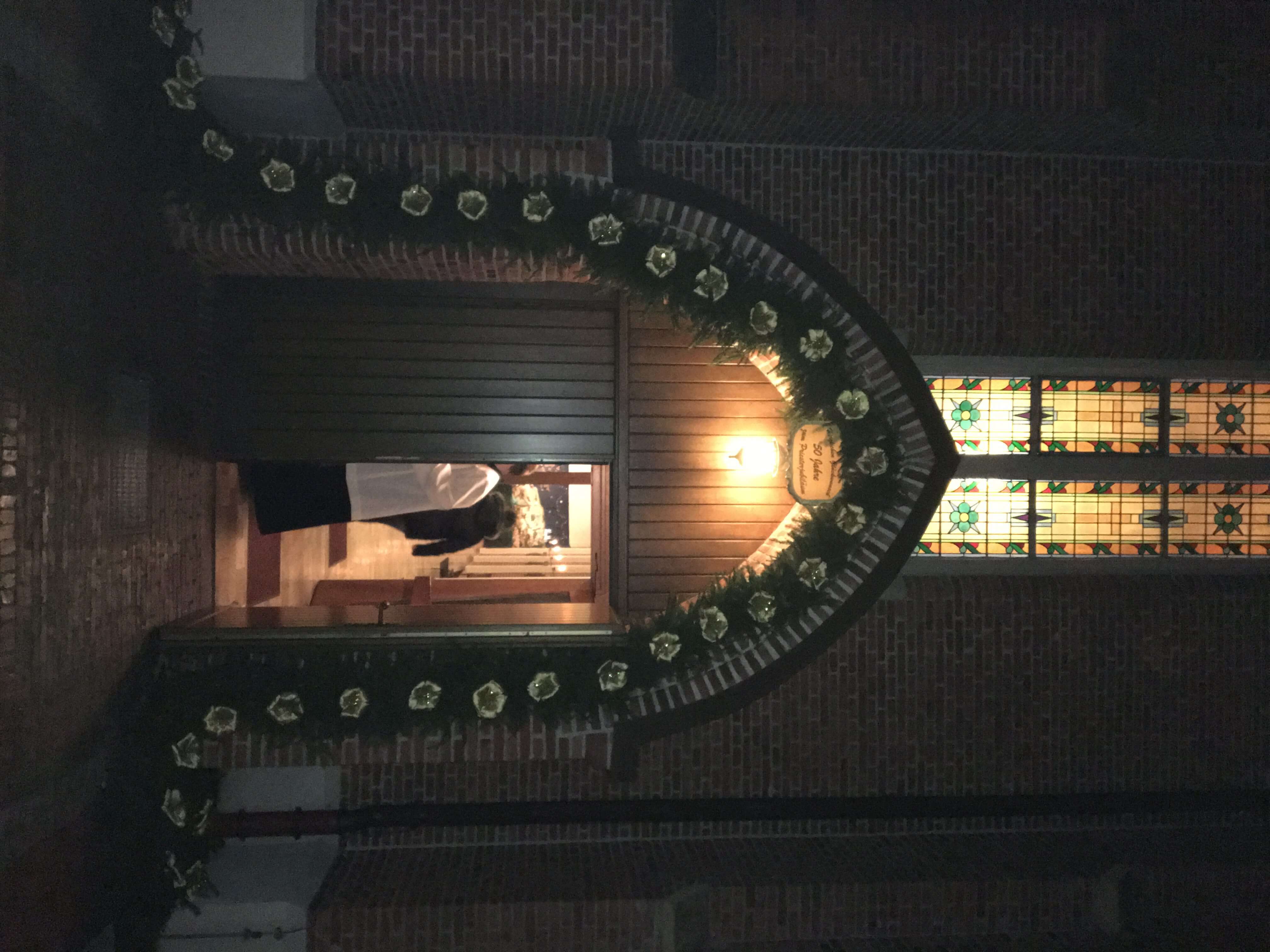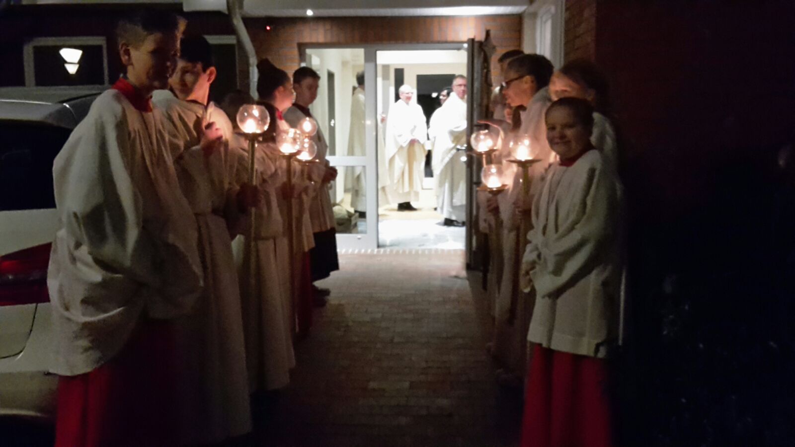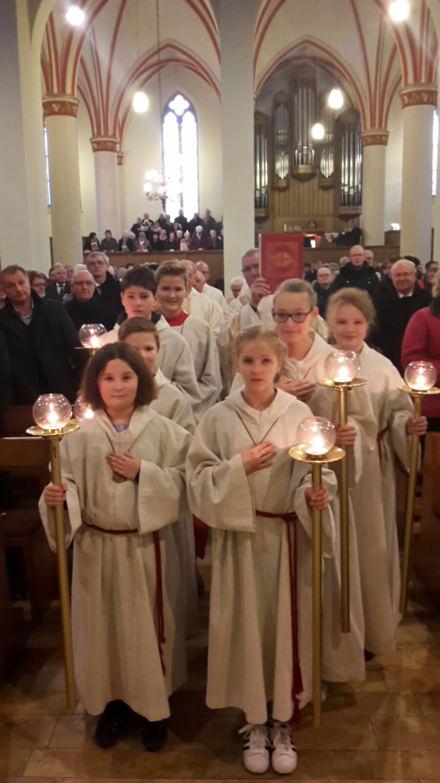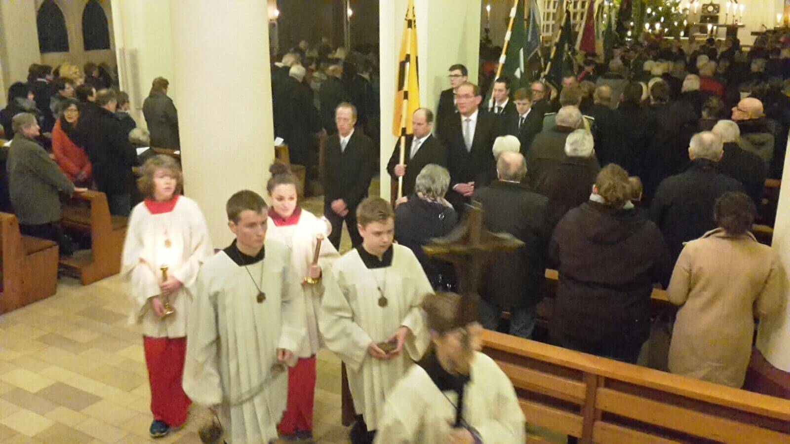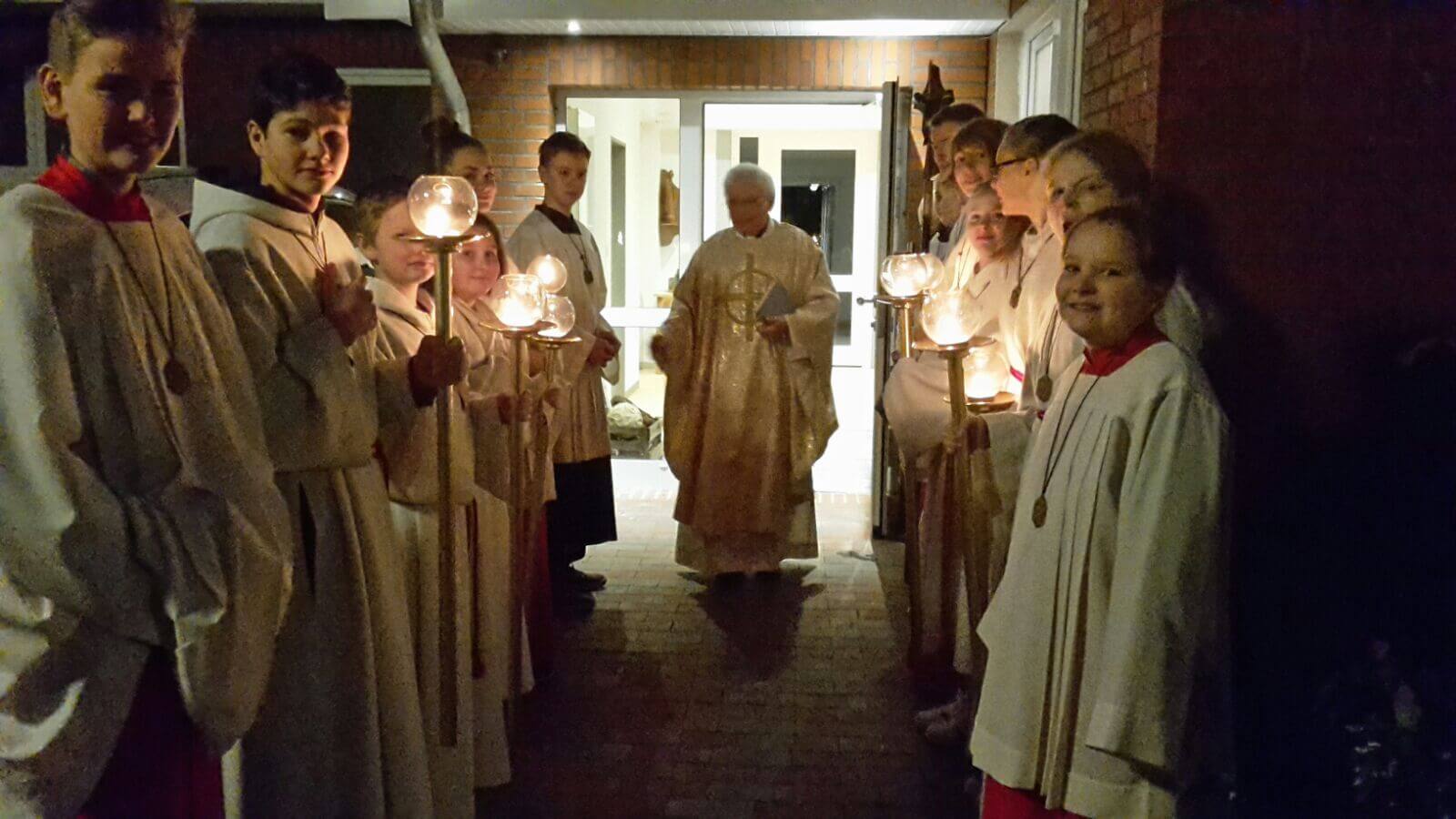 Zum feierlichen Auszug bildeten die Messdiener einen Kerzen-Spalier. Die Fahnenabordnungen und der Musikverein Harkebrügge geleitete alle Besucher zur anschließenden Feier von der Kirche ins Pfarrheim, wo die gesamte Gemeinde zu einem gemeinsamen Abendbrot eingeladen war.