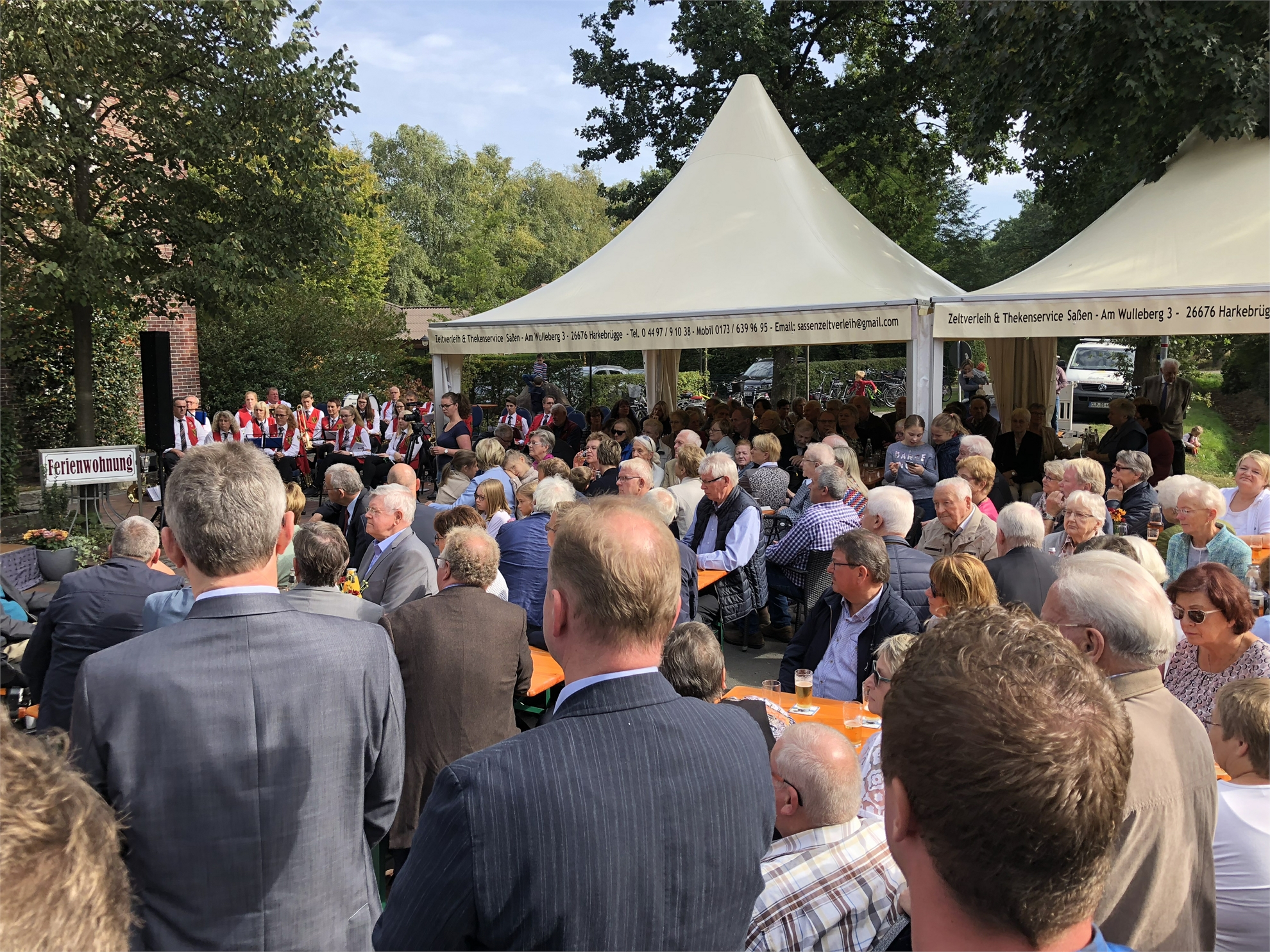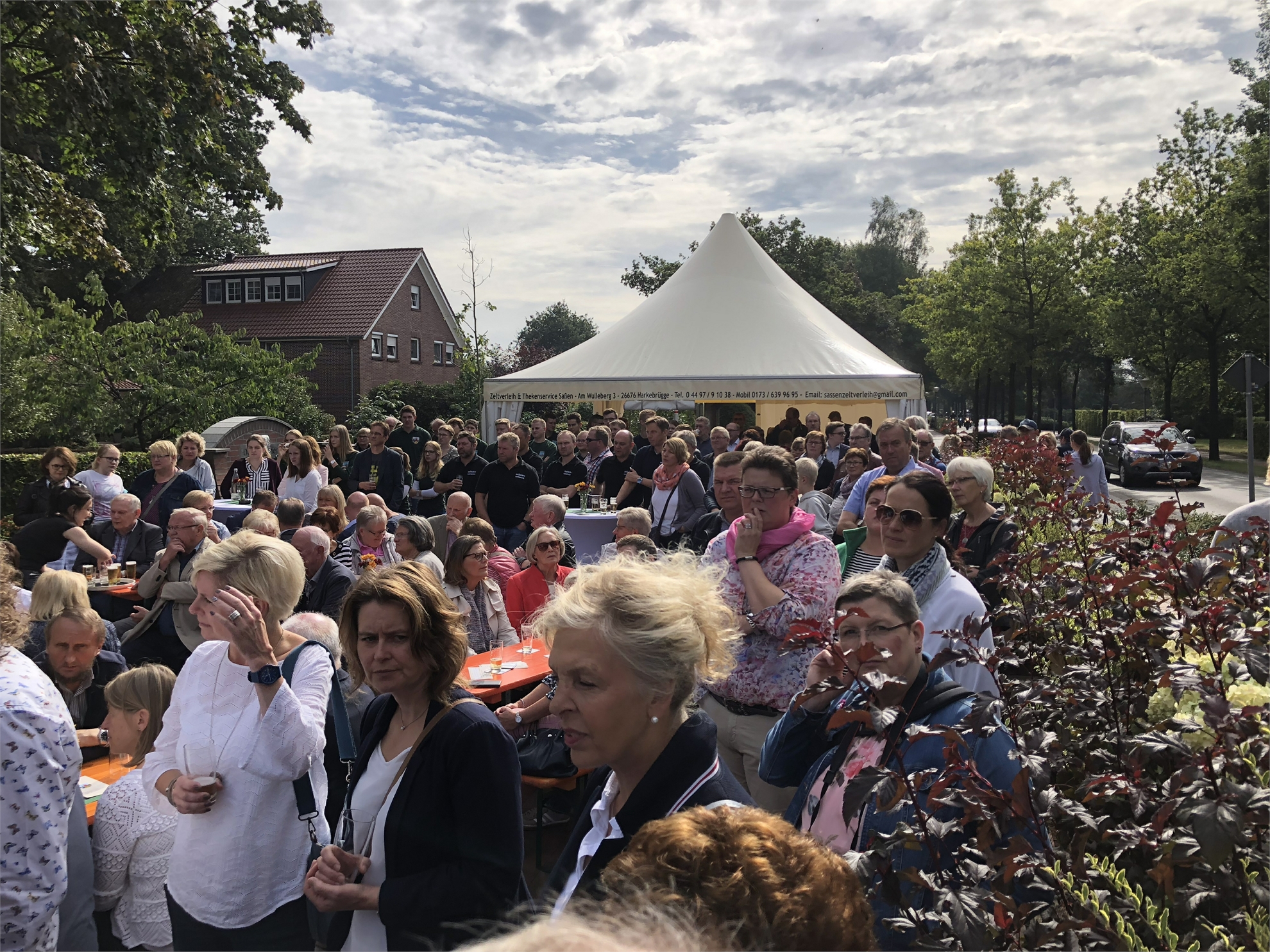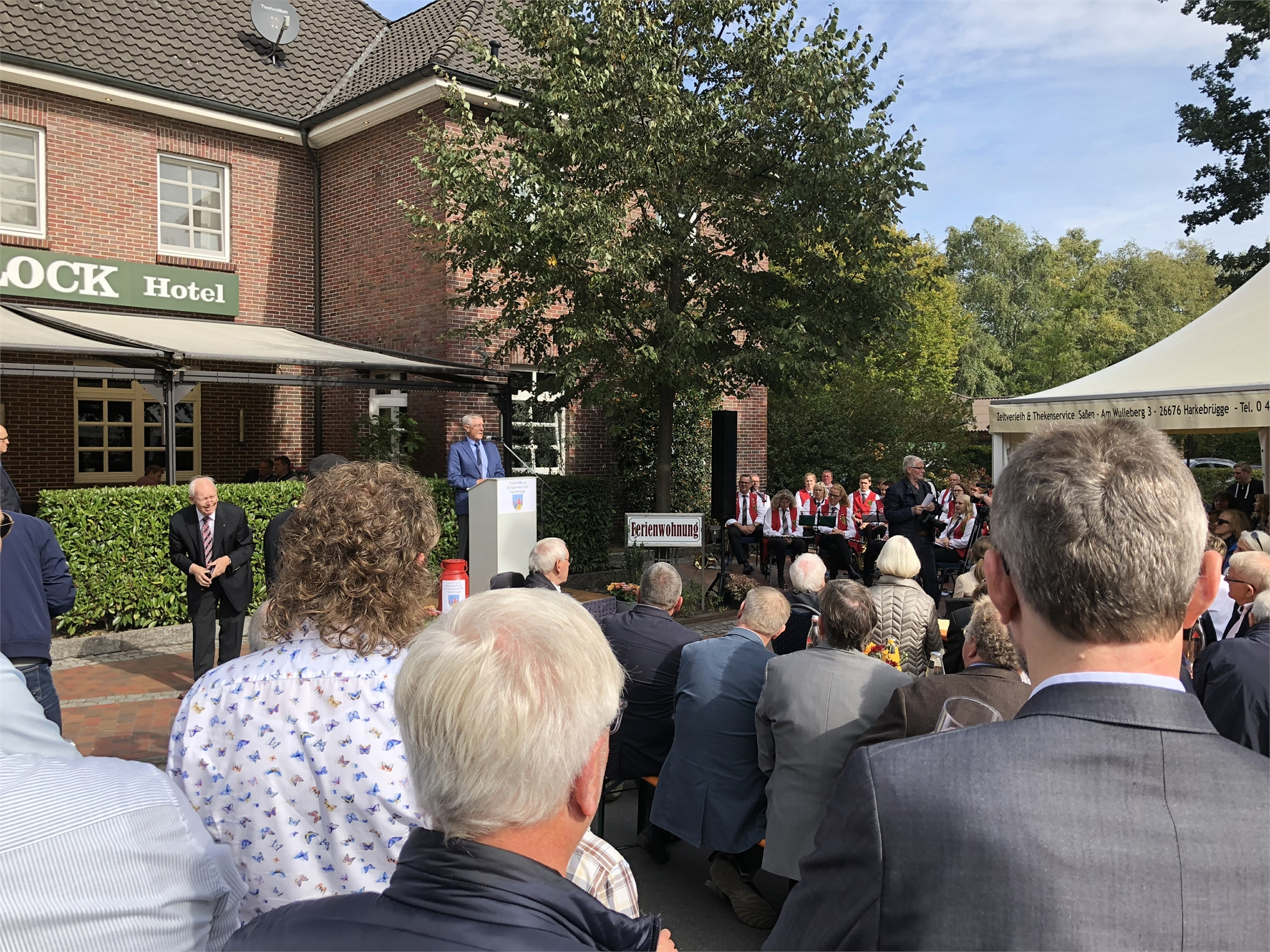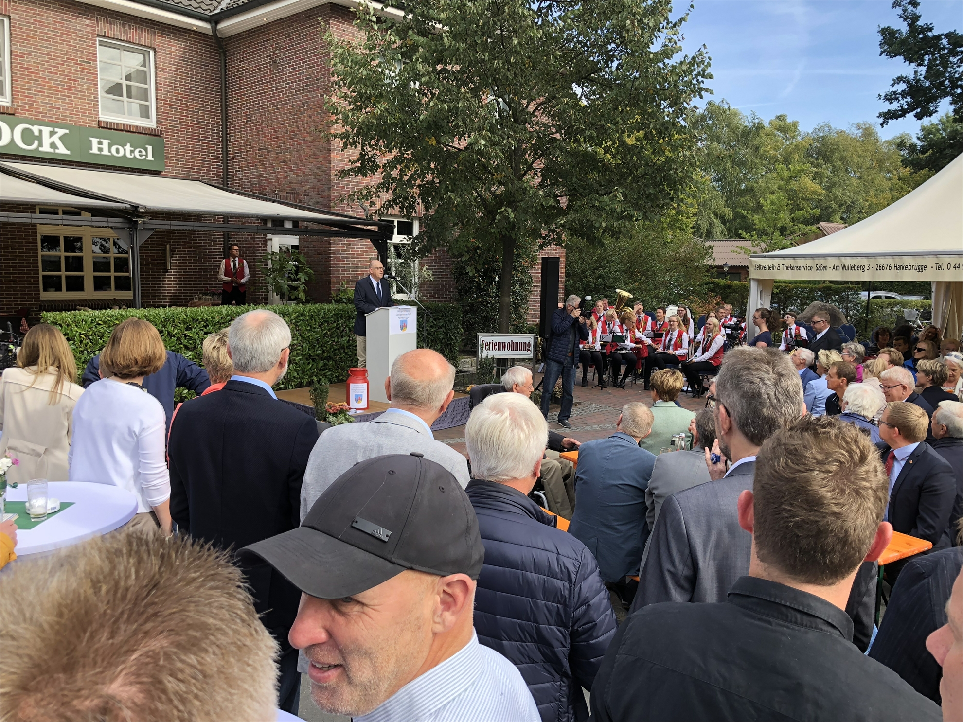 Harkebrügge 16.09.2018 – Es ist vollbracht: Die Bürgerstiftung Dorfgemeinschaft Harkebrügge feierte am Sonntag bei bestem Sonnenschein am Brunnenplatz beim Gasthaus Block in Harkebrügge ihre Gründung. Vor rund 350 Gästen sprachen der Vorsitzende der Bürgerstiftung, Hans Eveslage, und der Vorsitzende des Stiftungsrates, Klaus Claassen, über die Stiftungsziele sowie bereits umgesetzte Projekte. „Mithilfe der 121 Stifter wollen wir Gutes tun für die Zukunft unseres Dorfes. 80 350 Euro wurden der Stiftung bereits anvertraut“, sagte Eveslage. Die Bürgerstiftung habe sich unter anderem die Förderung der Jugend- und Altenhilfe aber auch von Sport, Kunst und Kultur zum Ziel gesetzt. Ein erster Meilenstein sei die zukünftige Nutzung des ehemaligen Pfarrhauses als Heimathaus gestartet. Ein weiteres Projekt sei der Beitrag für die Einrichtung eines neuen Gruppenraumes im Kindergarten Harkebrügge.