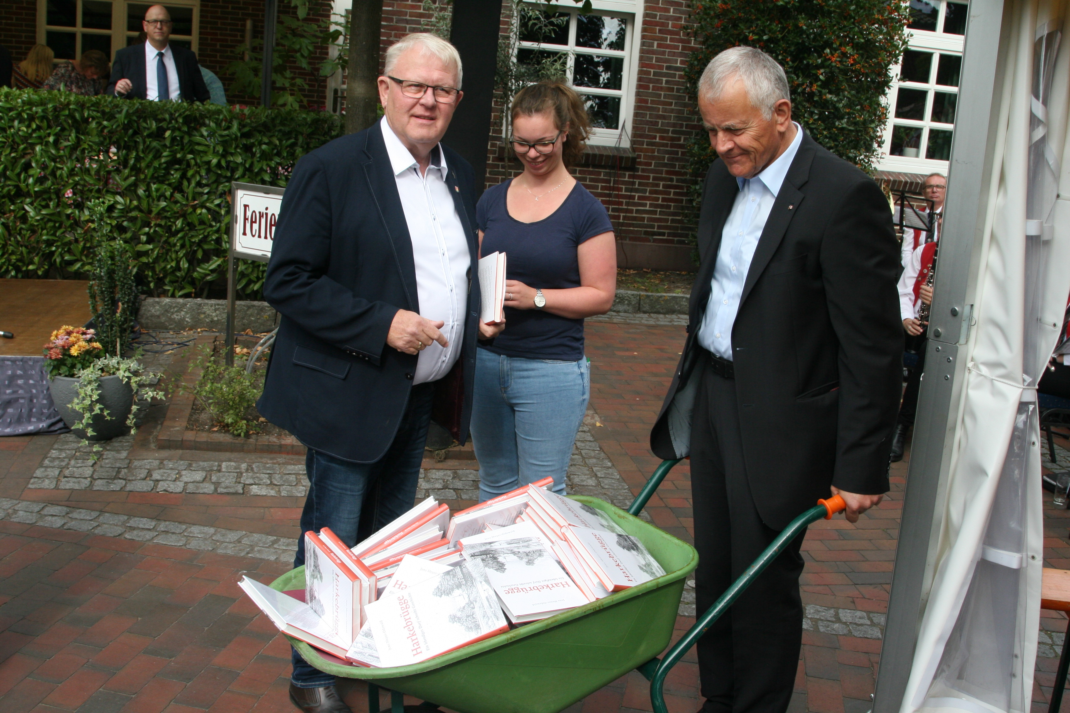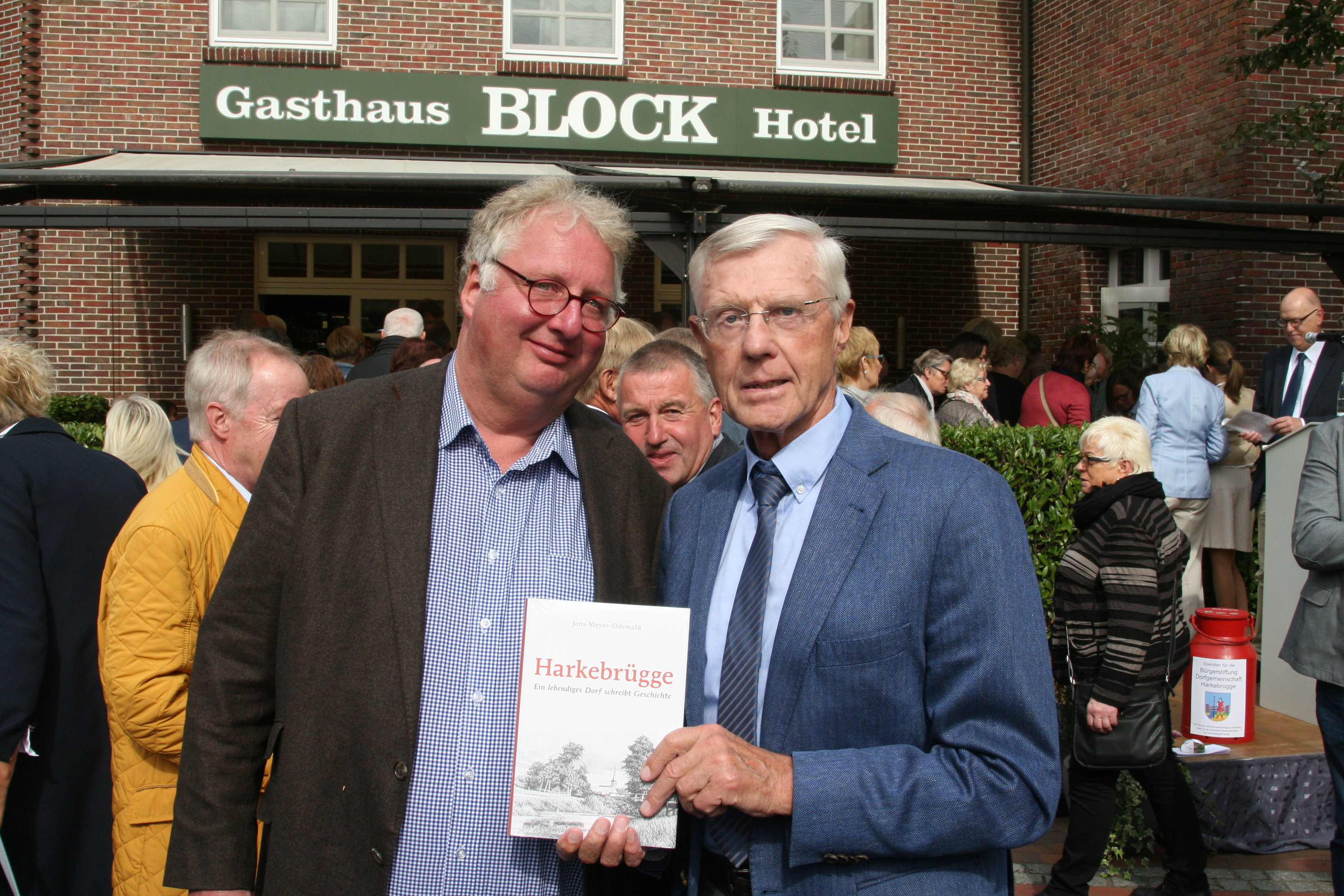 Zu den Förderern der Stiftung zählt auch der gebürtige Harkebrügger und Hamburger Gastronom Eugen Block, der vor wenigen Tagen seinen 78. Geburtstag feiern konnten. Zusammen mit Autor Jens Meyer-Odewald aus Hamburg stellte er im Rahmen der Gründungsfeier das Buch „Harkebrügge – Ein lebendiges Dorf schreibt Geschichte“ vor. Damit zeigte Eugen Block der Heimat seine Verbundenheit. Symbolisch überreichte er das neu erschienene Buch an die Bürgerstiftung Dorfgemeinschaft Harkebrügge. Die Erlöse des Buchverkaufes kommen in komplettem Umfang der Stiftung zugute.