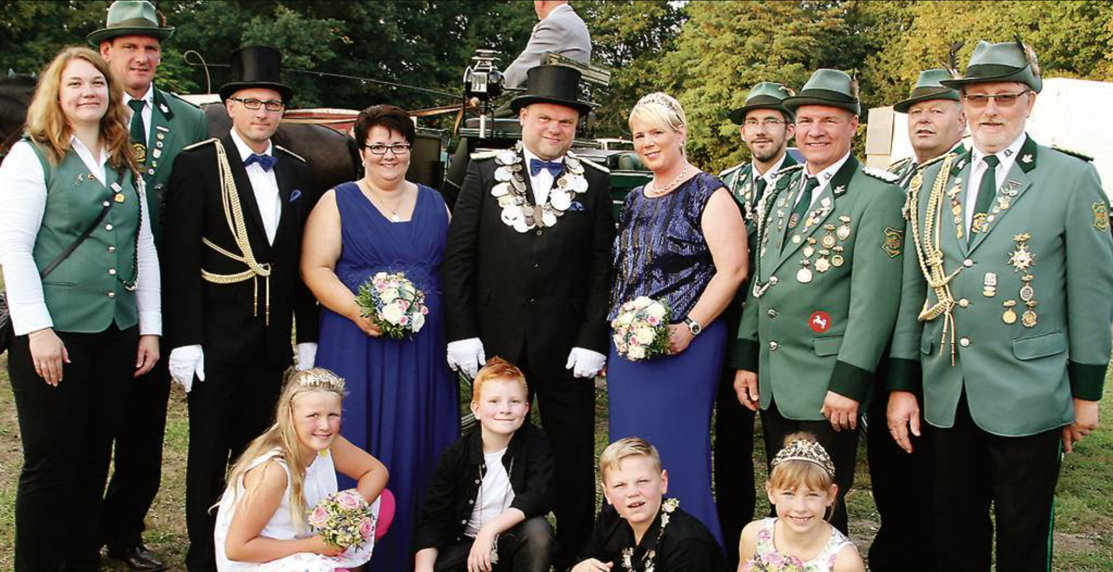 Die Inthronisierung war der Höhepunkt des 99. Volksschützenfestes in Harkebrügge. Die feierliche Proklamation der Königshäuser verfolgten mehrere Hundert Besucher. Dazu waren fast sämtliche Schützen des Vereins zur Freude des Vorstandes angetreten. König Matthias I. bedankte sich bei seiner Antrittsrede besonders bei der Bevölkerung und bei den Nachbarn für die wunderbare Ausschmückung des Dorfes. „Uns bot sich ein imposantes Bild, als wir mit der Kutsche durch den Ort fuhren. Das ist einmalig in Harkebrügge“, meinte der neue Regent.